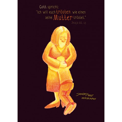 Postkarte "Ich will Euch trösten wie einen seine Mutter tröstet", Jahreslosung 2016, dunkle Version. 105x148 mm, Hochformat. Erläuterungen zu den Postkartenmotiven von Jocky auf http://www.jocky.de/postkarten.