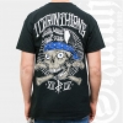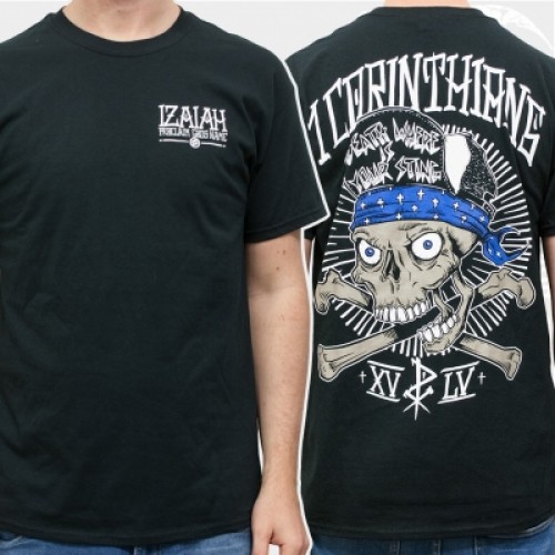 Schwarzes T-Shirt Bandana Skull von Izaiah. Aufdruck in weiß, grau und blau: vorne links Izaiah-Logo, hinten "1 Corithians 15:55 - Death where is your sting"