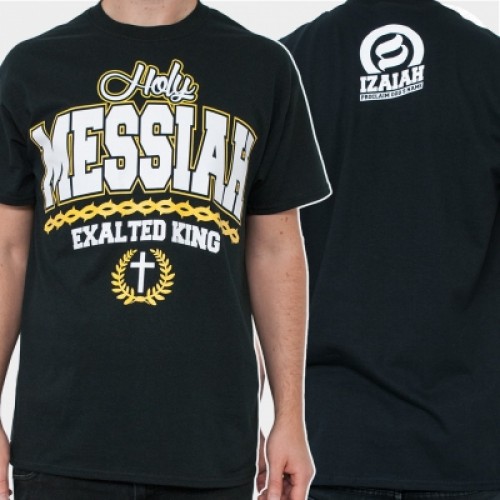Text Design: vorne mittig: Holy Messiah - Exalted King (ca. 38x38 cm), hinten auf Nackenhöhe: Izaiah-Logo (ca. 11x9 cm)