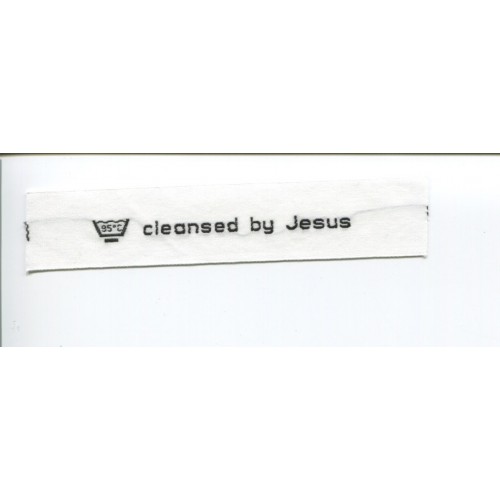 Aufnäher cleansed by Jesus. Weißer Stoff mit schwarzem Stick, Gesamtgröße ca. 2,5x9 cm. Die Aufnäher haben eine beschichtete Rückseite, die sich beim Aufbügeln mit dem Untergrund verbindet. Für bessere Haltbarkeit sollten sie aber aufgenäht werden. Waschbar.