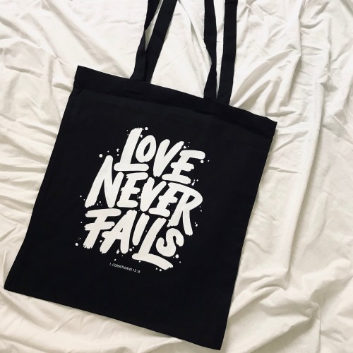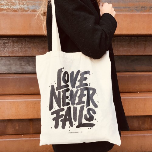 Der Stoffbeutel “Lover never fails” kommt inhaltlich nach 1. Korinther 13,8 und bedeutet übersetzt