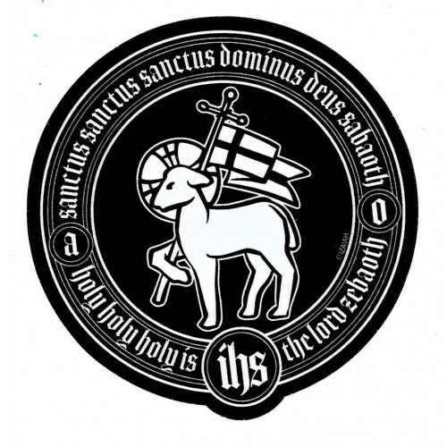 Aufkleber Sanctus von IZAIAH. Schwarz-weiß, rund / formgestanzt, Durchmesser ca. 10,5 cm.