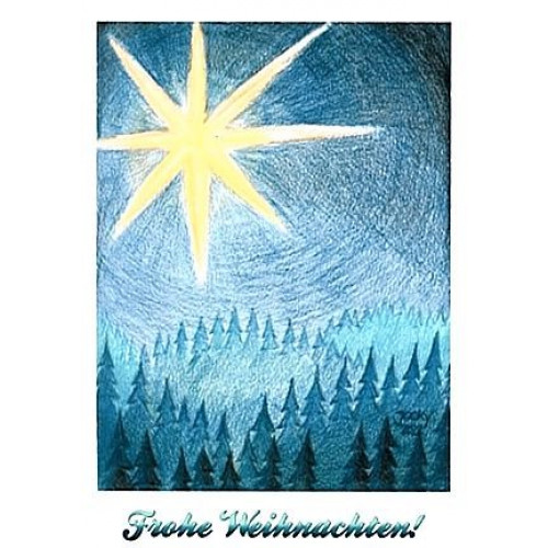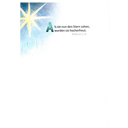 Auf der Innenseite findet sich links das abgesoftete Bildmotiv mit dem simplen Vers: „Als sie nun den Stern sahen, wurden sie hocherfreut.“ Matthäus 2, 10